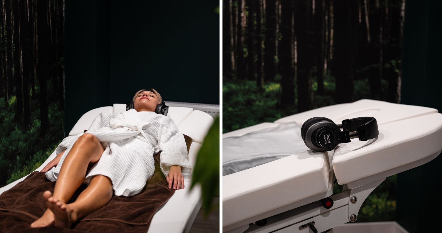 Do gabinetu wchodzi się w szlafroku i bez telefonu. Kładziesz się na ciepłym materacu wodnym, zakładasz słuchawki i zamykasz oczy. Przez całą sesję towarzyszy Ci specjalnie dobrana muzyka, subtelne wibracje i łagodnie zmieniające się światła.